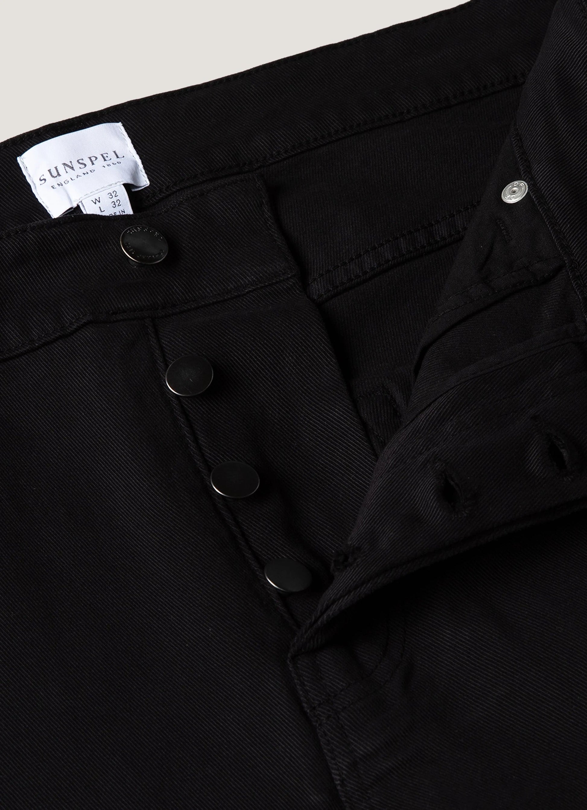 An easy, everyday straight-leg trouser with a mid-rise cut, crafted from French cotton drill. Garment-dyed for a relaxed, broken-in feel, it features two curved front pockets, a ticket pocket, and two back pockets finished with refined horn buttons. A versatile smart-casual essential, offering a polished alternative to jeans.