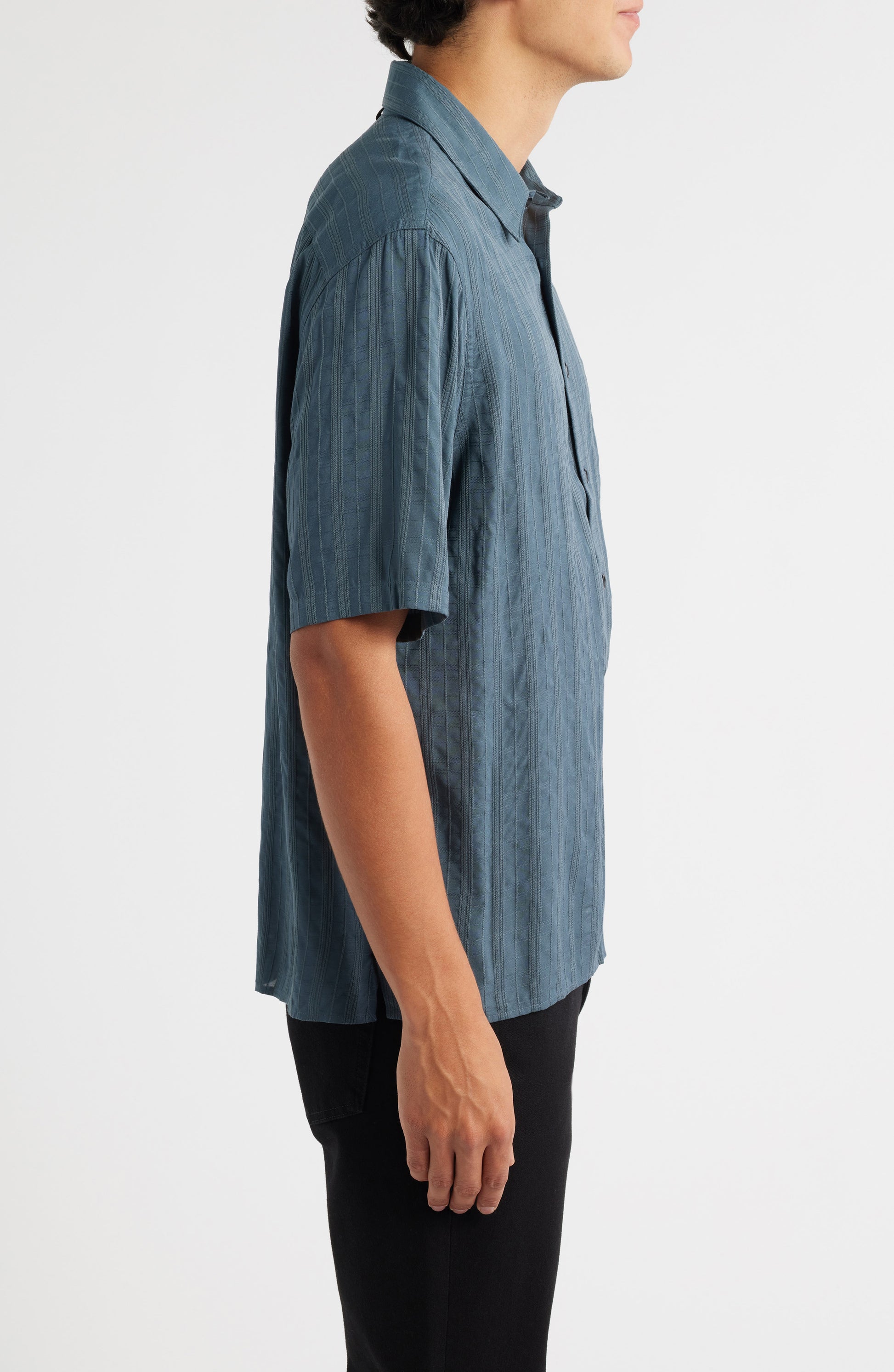 The Dalton shirt is crafted with refined attention to detail. What appears at first glance to be a vertical stripe pattern is actually a subtle plaid, created through horizontal stripes woven with dimensional dobby stitching. This elevated short-sleeve style offers a polished, modern look.