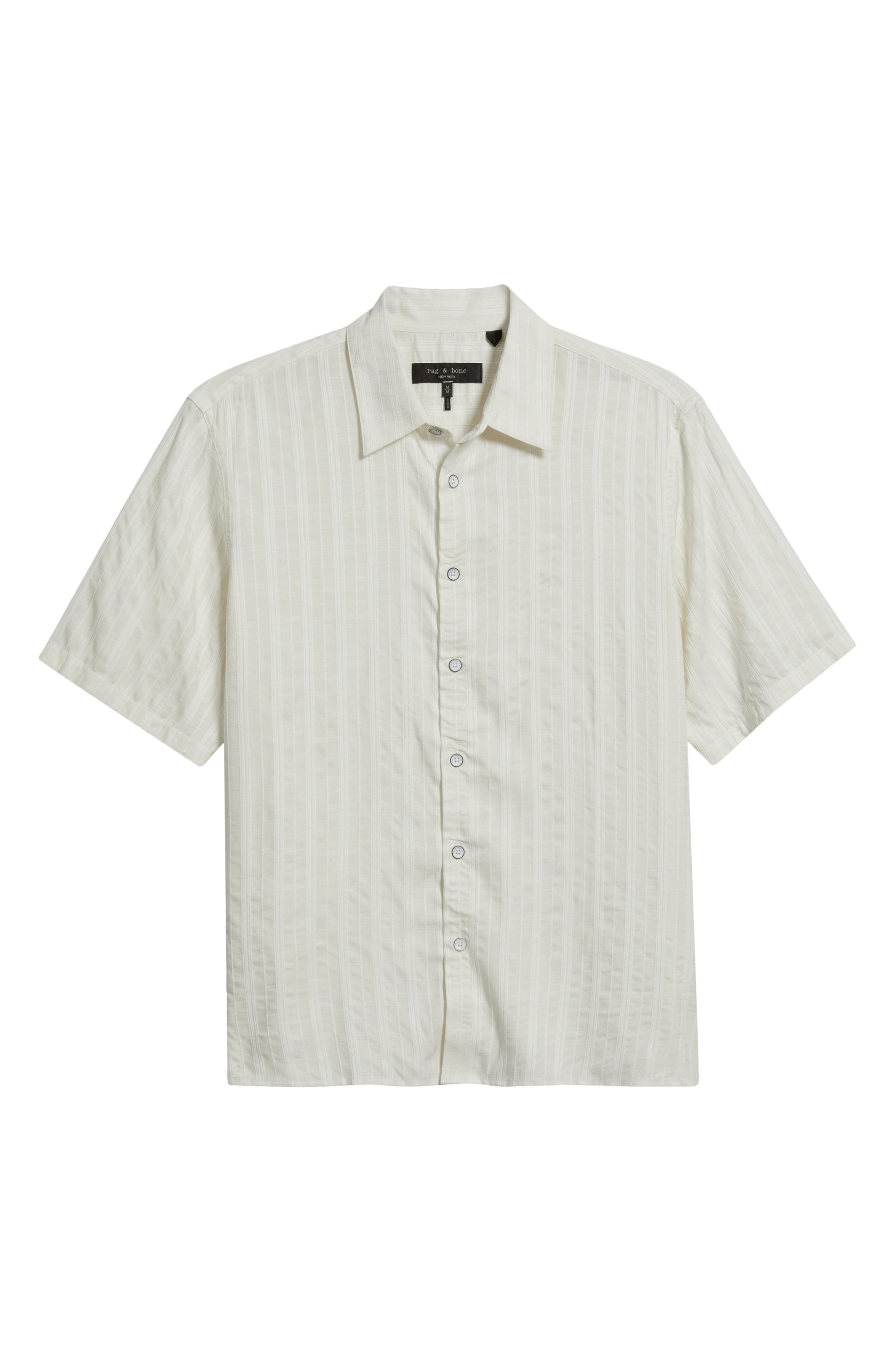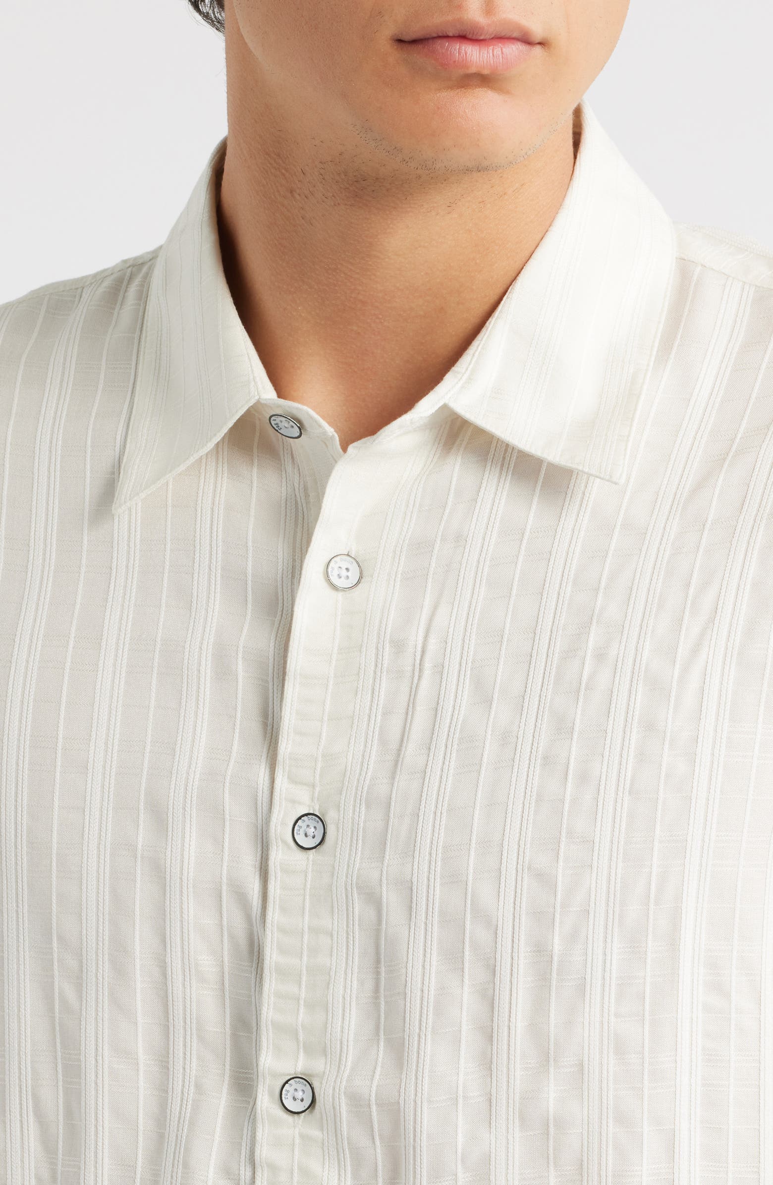 The Dalton shirt showcases refined craftsmanship. What may appear to be simple vertical stripes is actually a subtle plaid pattern, created through horizontal stripes woven with dimensional dobby stitching. The result is a polished, modern short-sleeve shirt with understated texture and depth.