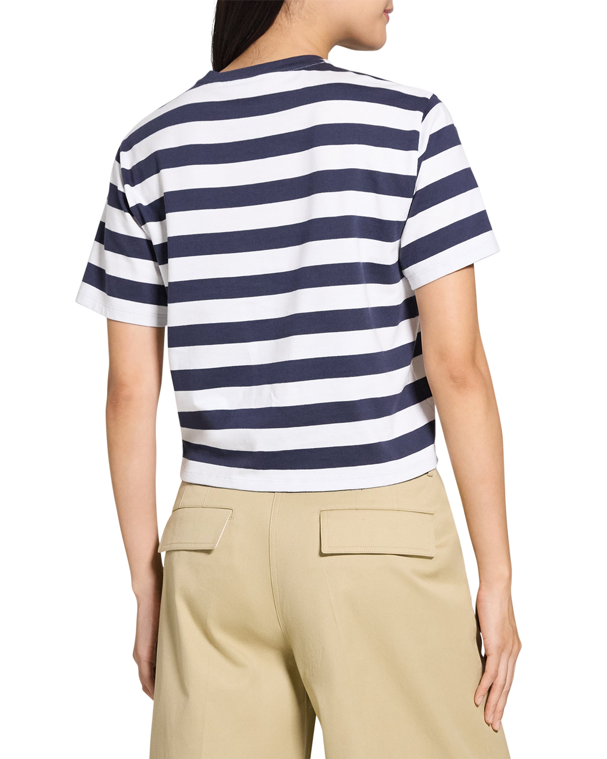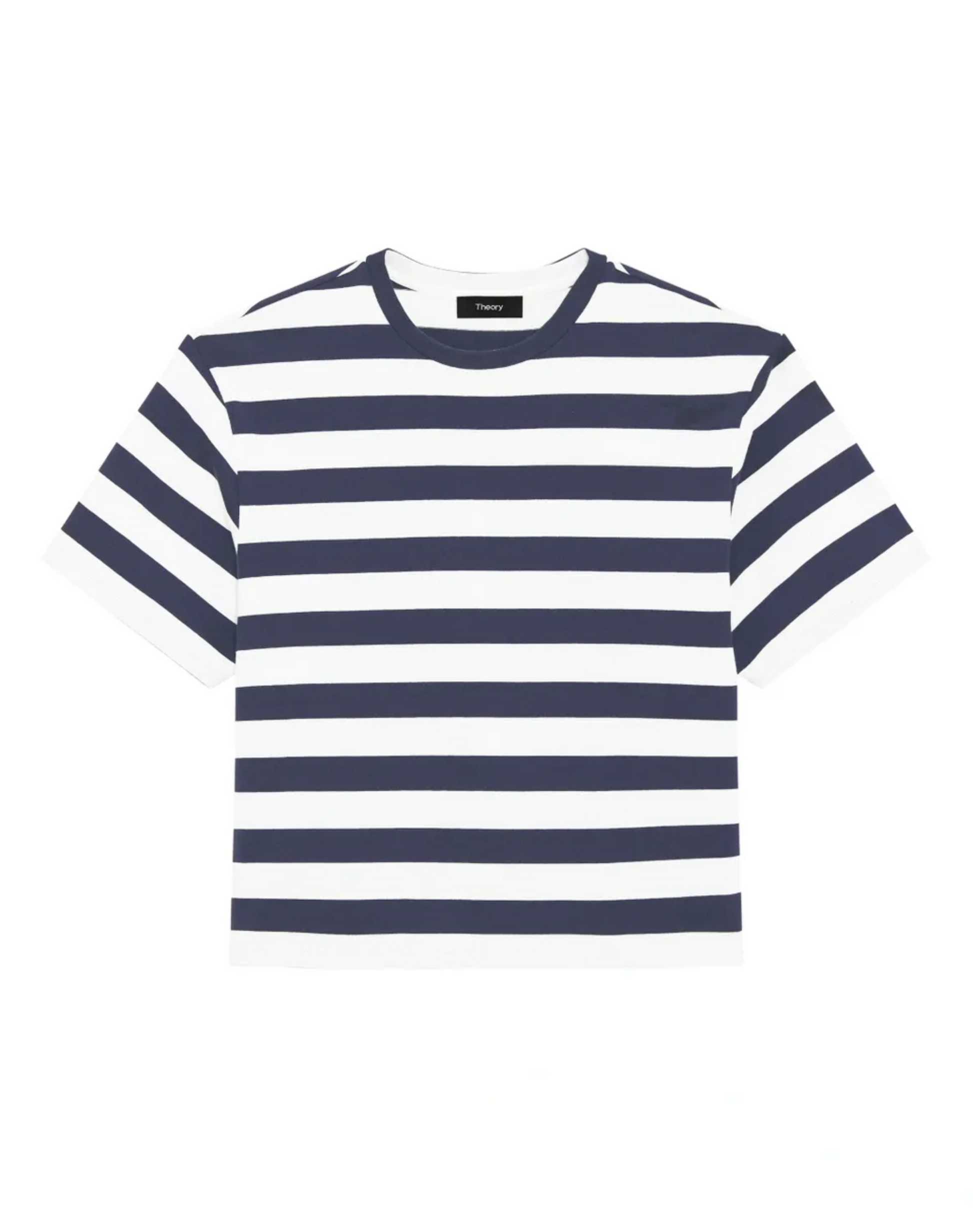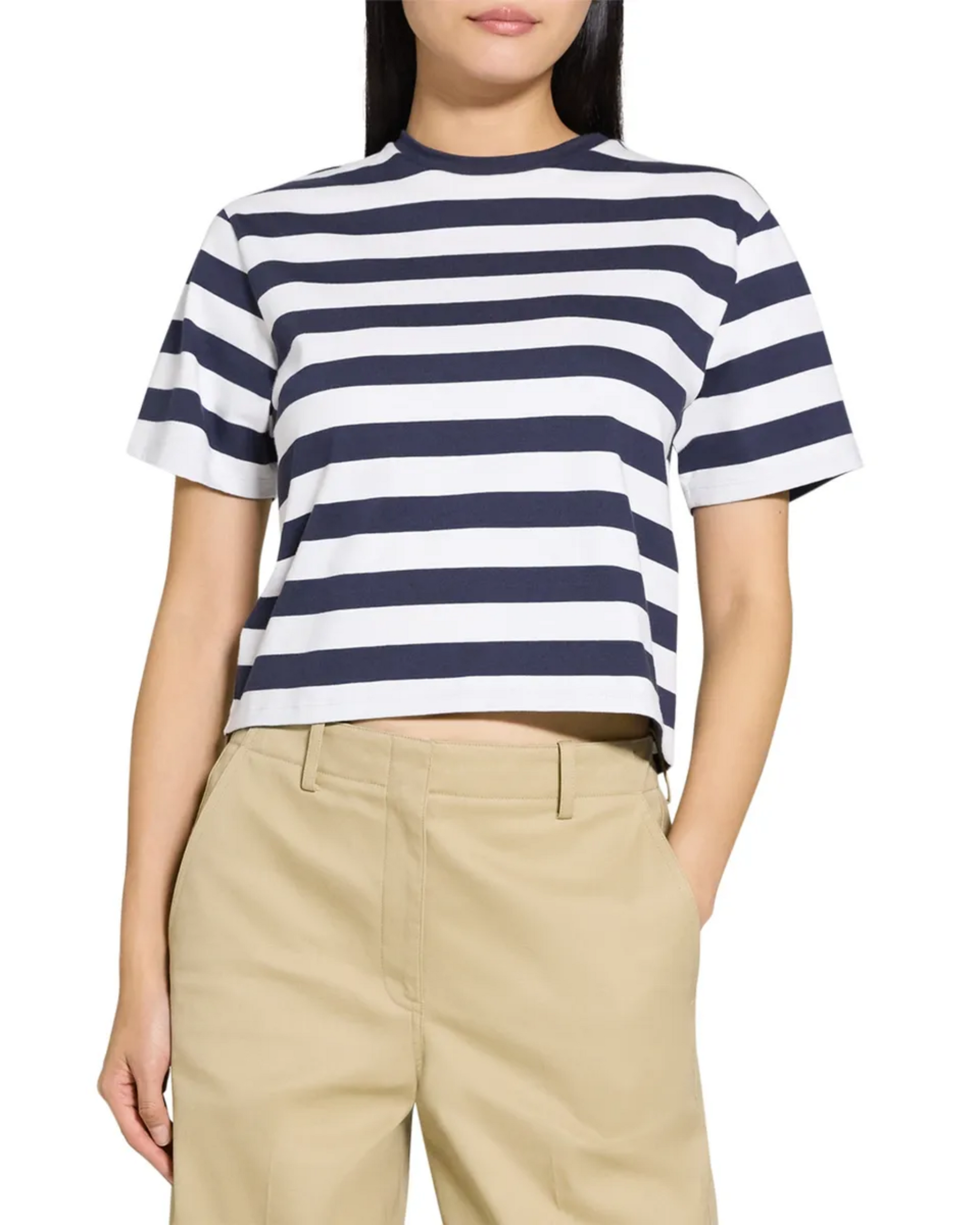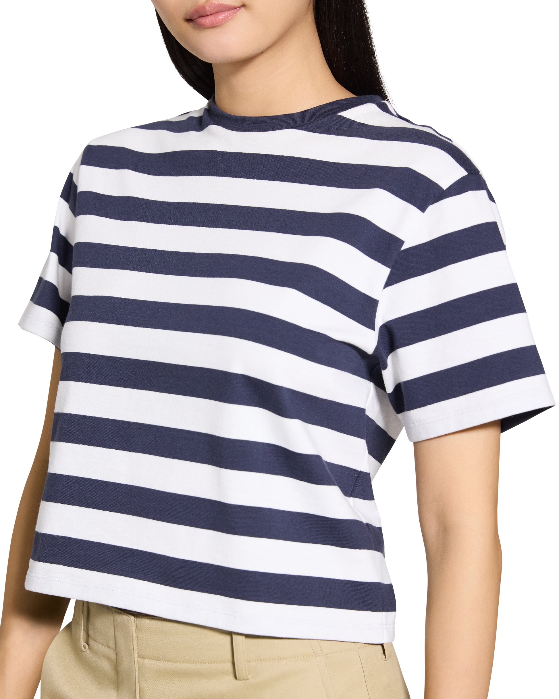 Our fresh approach to the classic tee is cut for a relaxed, boxy fit with a pair of ruched short sleeves. Finished with a crew neckline, it’s cropped in a substantial cotton jersey with a staple-worthy stripe and natural stretch.Fit