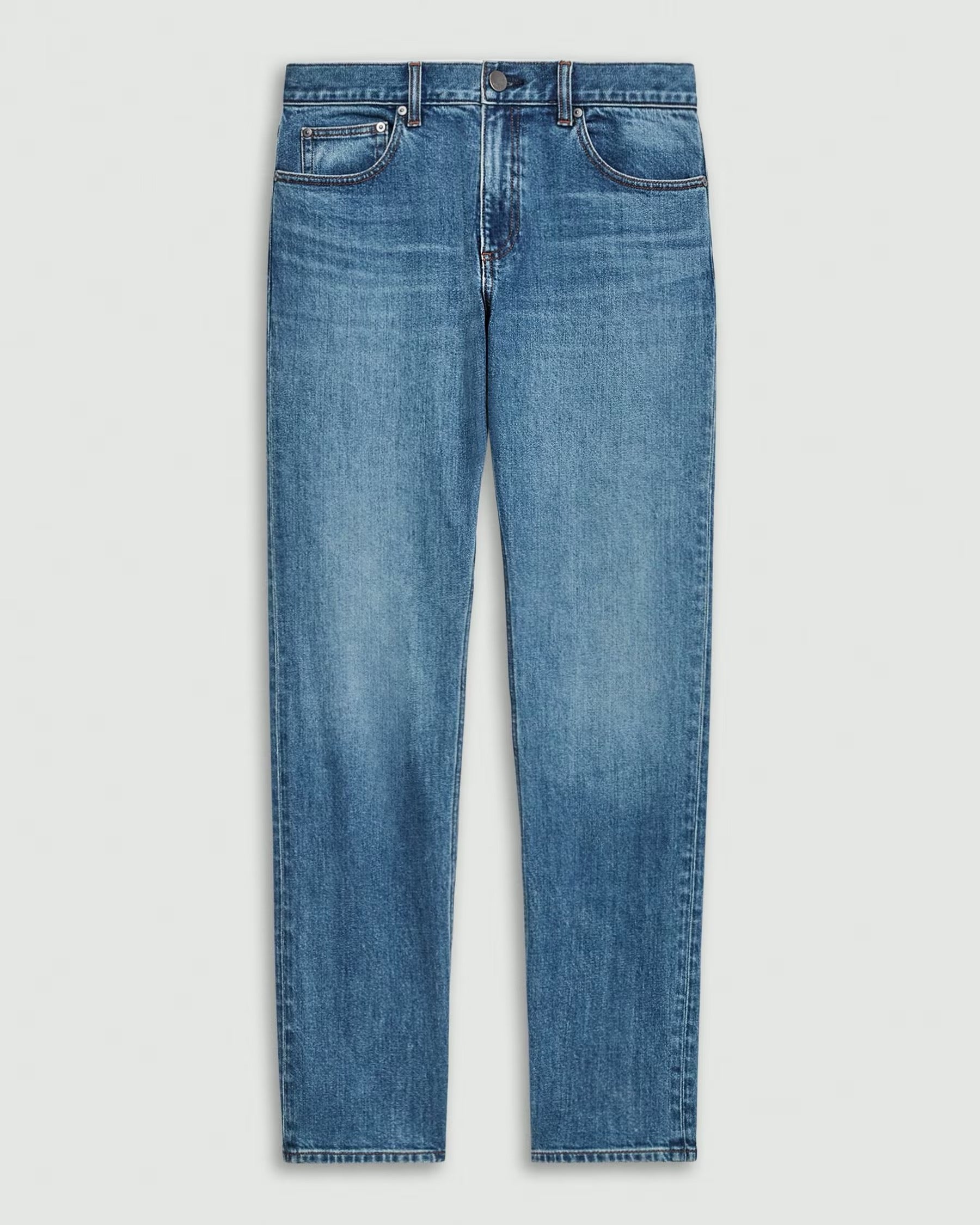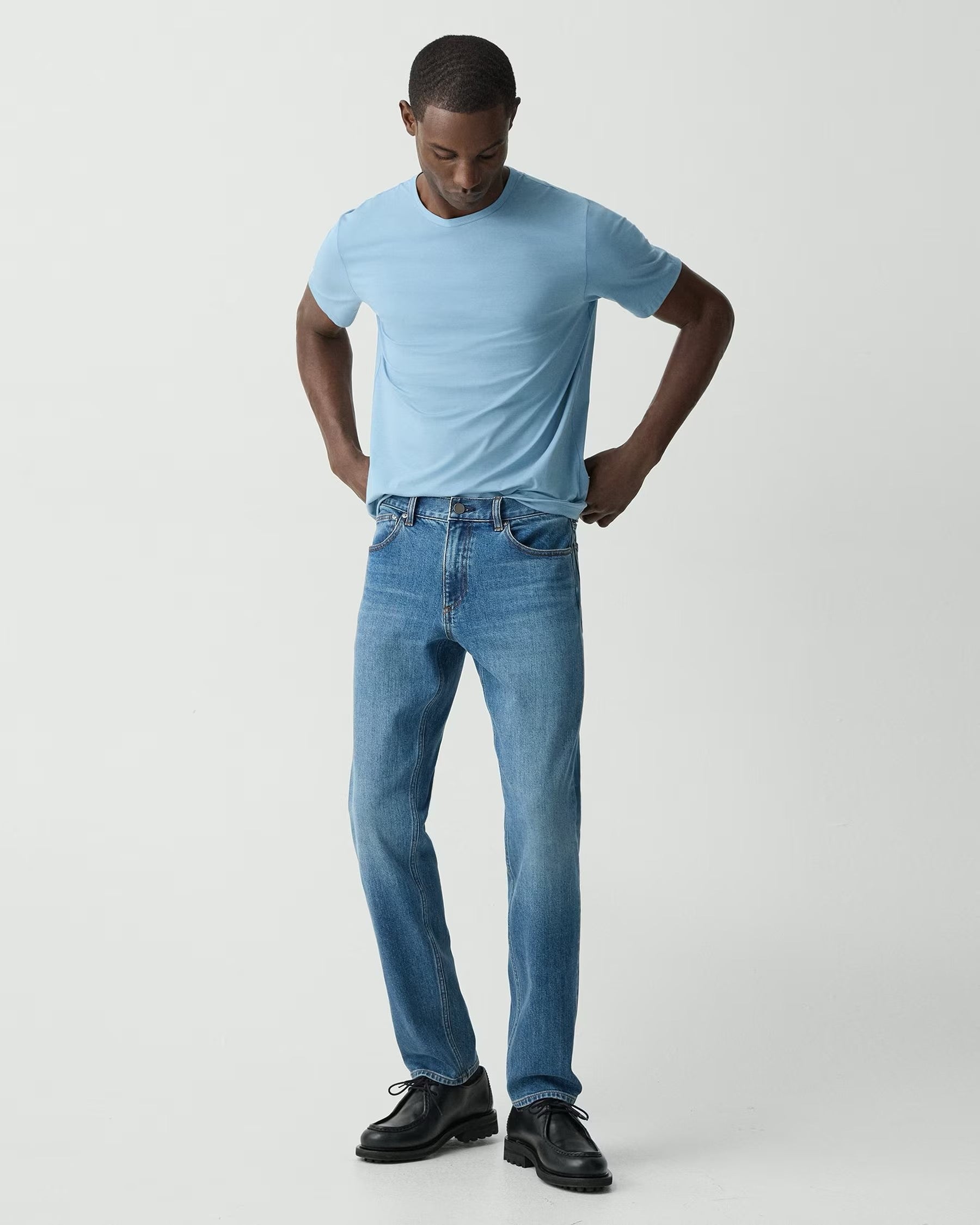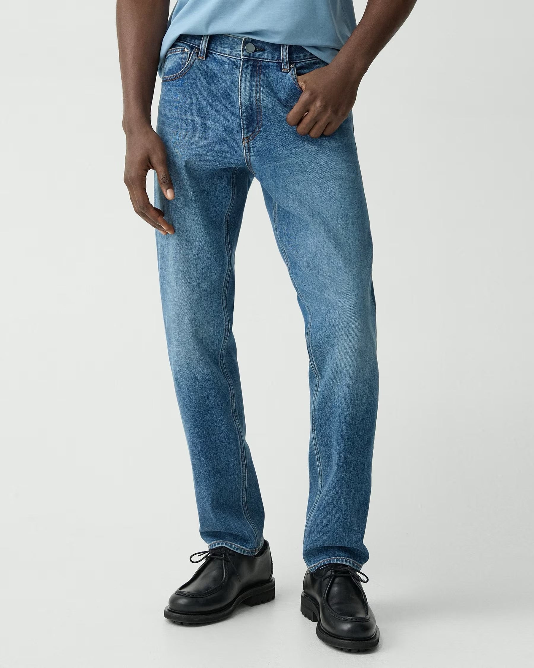 Theory's signature five-pocket jeans are designed with a slim leg from hip to ankle, belt loops, and a button-zip closure. Tailored for a flattering fit, this pant is crafted in Italian comfort stretch denim that's dyed with a deep, rich wash produced by a leading supplier outside of Milan.